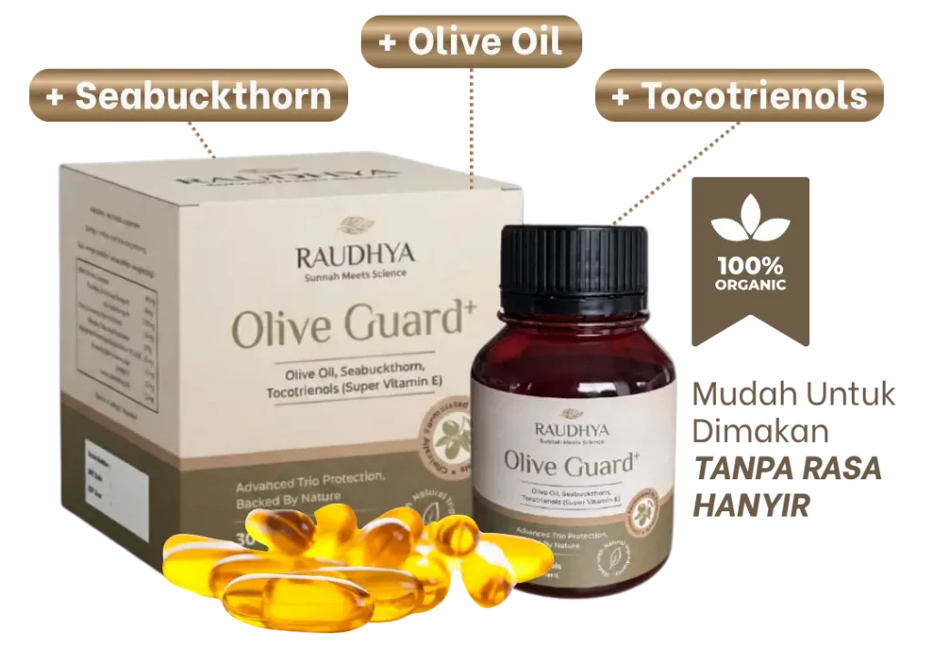 Raudhya OliveGuard+ Diperkaya Bahan Aktif Polyphenols, Tocotrienols (Super Vitamin E) & Omega Aktif Menyokong Kawalan Gula, Kolesterol & Tekanan Darah